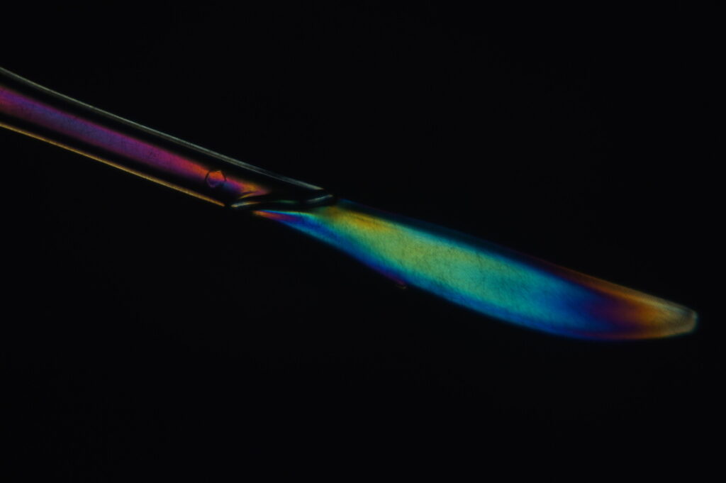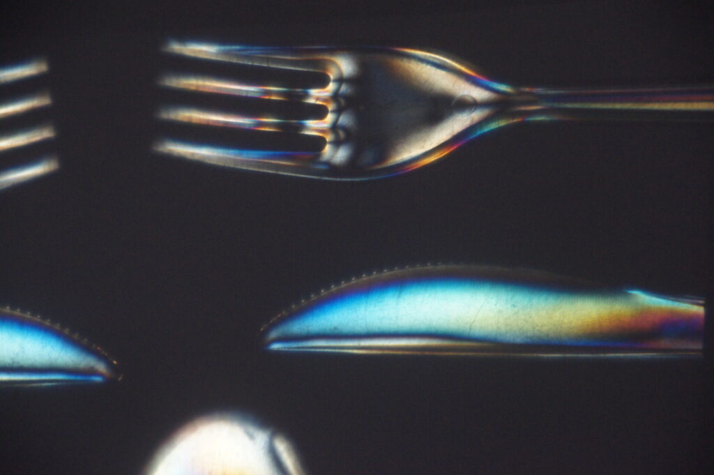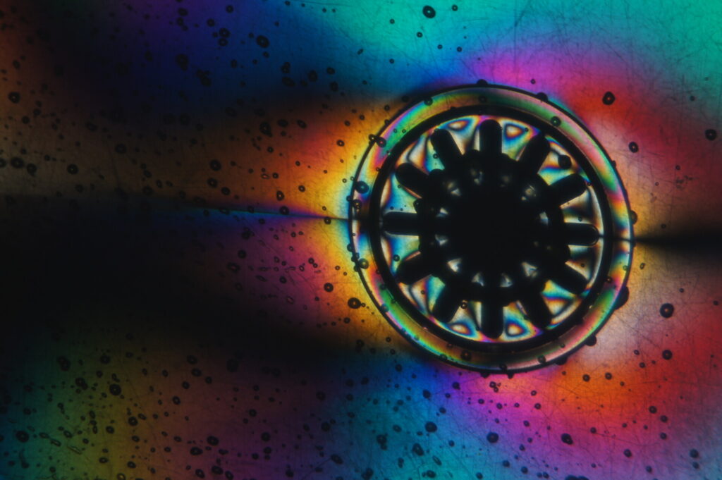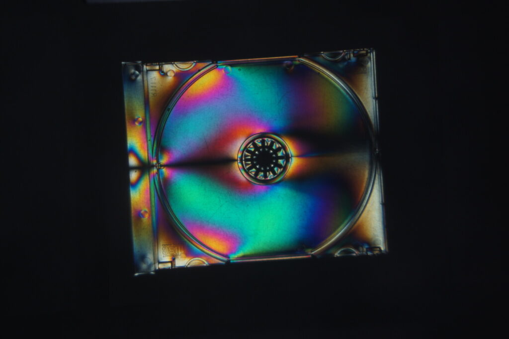 Für diese Bildserie habe ich mit Lichtbrechung und transparenten Materialien gearbeitet. Das Licht des Overheadprojektors fiel durch verschiedene durchsichtige Kunststoffobjekte, die unter einer glatten, transparenten Glasplatte lagen. Durch Spannungen und Strukturen im Plastik entstanden die intensiven, regenbogenartigen Farben. Die Projektion wurde auf eine Leinwand geworfen, von der ich die Effekte anschließend mit der Kamera fotografiert habe. So entstanden abstrakte Aufnahmen, die zeigen, wie Licht, Material und Projektion zusammenwirken.